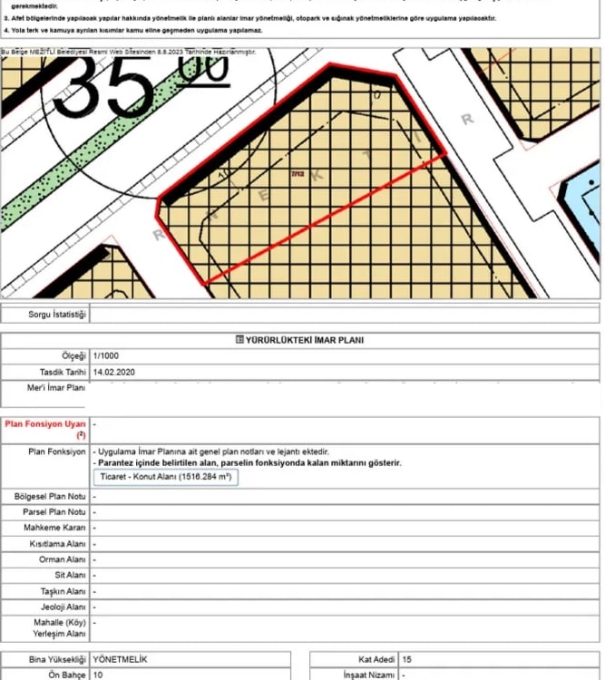 Belediyeden alınan imar durumu:
